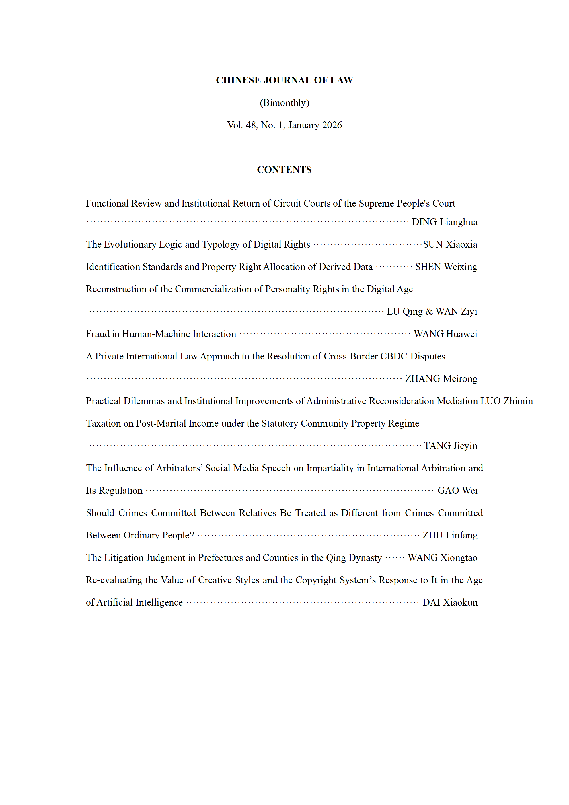 CHINESE JOURNAL OF LAW(1-2026)