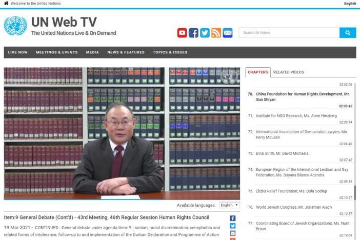 The 46 Regular Session of the UN Human Rights Council was held in Geneva on February 22 – March 23, 2021. Professor Sun Shiyan, the head of the International Human Rights Law Department of CASS Institute of International Law, was invited to attend the session and give a video speech at the general debate under agenda item No. 9: Racism, Racial Discrimination, Xenophobia and Related Forms of Intolerance.